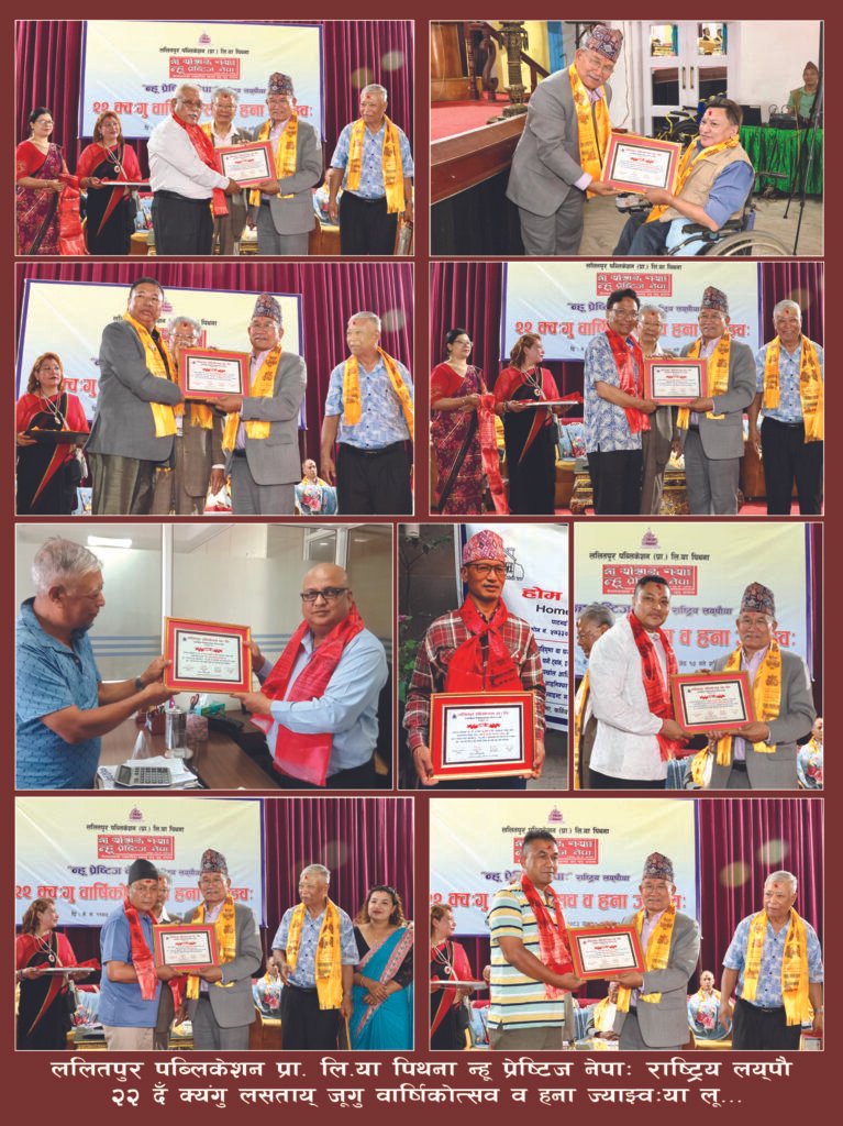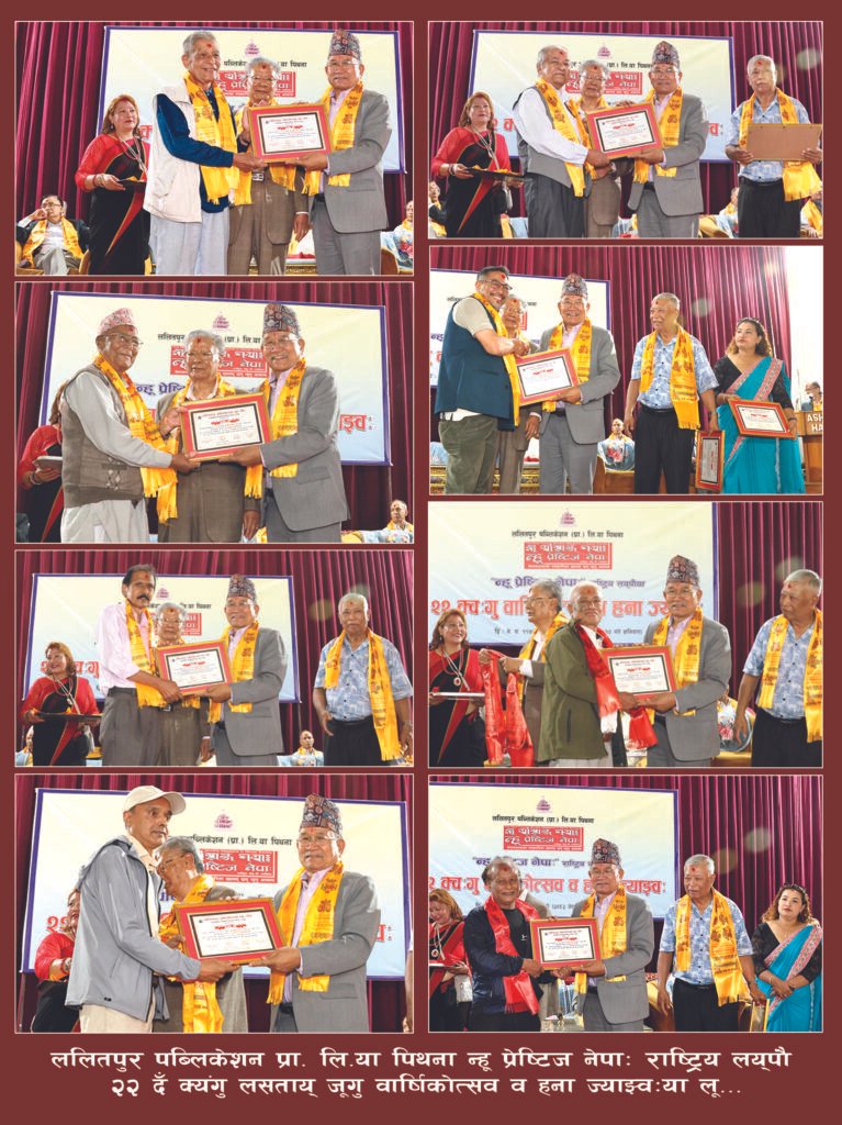यल, ललितपुर पब्लिकेशन प्रा. लि.या पिथना न्हू प्रेष्टिज नेपाः राष्ट्रिय लय्पौ २२ दँ क्यंगु लसताय् २२ क्वःगु वार्षिकोत्सव व हना ज्याझ्वः अशोक हलय् छगू ज्याझ्वःया दथुइ मूपाहाँ यल महानगरपालिकाया प्रमुख चिरीबाबु महर्जनं उलेज्या यानादिल । नुगः खँ तयेगु झ्वलय् मूपाहां महर्जनं पत्रिका निरन्तर पिदनाः २२ दँ थ्यंगु नेवाः ख्यलय् हे छगू दसू जूगु दु, यल नगरं पिहांवयाः स्वनिगः न्यंक व स्वनिगः पिने थीथी जिल्लाय् थ्यंकेफुगु व स्तरीय लेख रचना पिकयाः ब्वमिपिनिगु नुगः त्याकेफुगु यलवासीपिं नापं सकल नेवाःतय्गु गौरवया खँ खः धासें पत्रिका निरन्तर व अझ स्तरीयरुपं पिकायेगु अले ईकथं अनलाइनय् नं न्ह्यांवनेमाःगु दु, गुकियात यल महानगरपालिकां नुगः क्वसाय्काः ग्वाहालि यायेगु जुइ धकाः धयादिल ।
