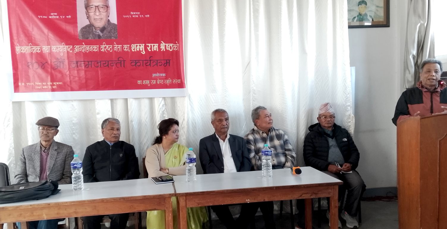 यल/का. शम्भुराम श्रेष्ठ स्मृति संस्थाया ग्वसालय् लोकतान्त्रिक व कम्युनिष्ट आन्दोलनया वरिष्ठ नेता का. शम्भुराम श्रेष्ठया १०४ क्वःगु जन्मजयन्तीया झ्वलय् लुमन्ति मुँज्या जुल । संस्थाया नायः गोर्की श्रेष्ठया सभापतित्वय् जूगु उगु ज्याझ्वलय् नेवाः न्ह्यलुवाः डा. महेशमान श्रेष्ठं राष्ट्रिय स्वाधीनता धइगु तसकं तःधंगु खँ खः । उकिं राष्ट्रिय स्वतन्त्रताया निंतिं शम्भुराम श्रेष्ठं बियादीगु बांलाःगु बिचाः व खँयात लुमंकाः झी भ्रष्टाचार, देशघाती, नश्लवादीया विरोधी जुइमाः । शम्भुरामं देय् व जनताया निंतिं बियादीगु बांलाःगु बिचाः व खँयात व्यवहारय् छ्यलायंकेगु झी सकसिगुं जिम्मेवारी खः उकिं झी गुलिनं थन मुनाच्वना सकसिनं व्यवहारय् छ्यल धाःसा छुं नं छुं उपलब्धी जुइगु खँ धयादिल ।